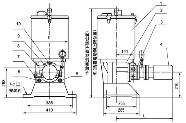 1、贮油筒;2、泵座;3、带连结法兰的柱塞泵装置;4、减速电机5、加油口G3/4;