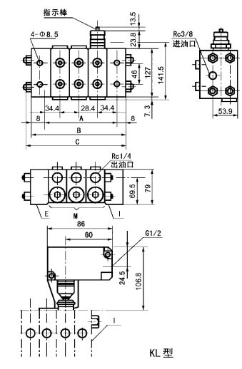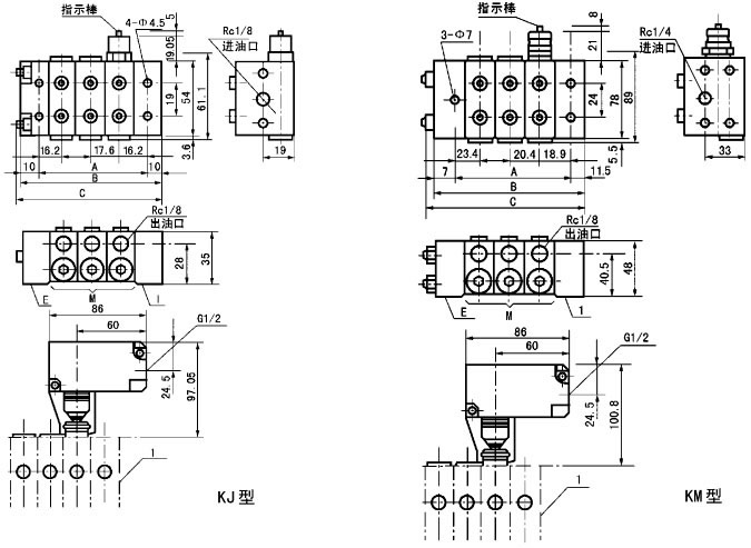 一、概述 KJ、KM、KL系列单线递进式分配器,适用于润滑点密集、耗脂量不同,给油频繁单线集中润滑系统中,组成子母式分配系统实现分区控制进行润滑的场合。 KJ、KM、KL系列单线递进式分配器,它由中碳合金结构钢制造的供给体、端部体和3~8片根据设计需要所确定的给油量和出油口数的中间体组合而成。分配器的正常出口设置于分配器的两侧面,在上面还设置有预备出口,各中间体的出油口内均装有止回阀,能彻底防止因润滑点背压作用而产生润滑脂的逆流,保证了各出油口的给油量定量、准确。
