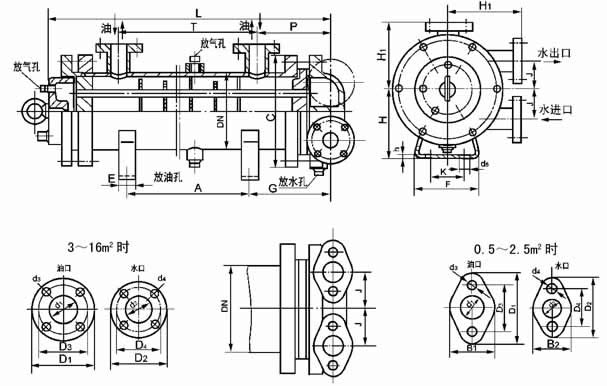 冷却面积0.5~2.5m2时进出水口型式;