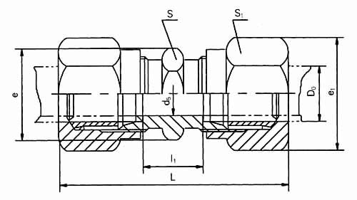 公称压力J级,管子外径D0为14mm的卡套式直通管接头: