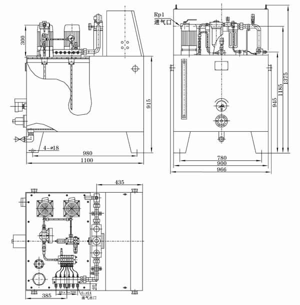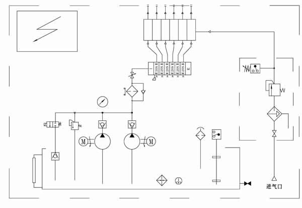 该站主要由油箱(带电加热器、液位计、电接点温度计、空气滤清器、液位控制器)、两台高压油泵装置(一备一用)、溢流阀、二位二通电磁阀、过滤器、单向阀、压力表、KM型递进式分配器、油气混合器、压力控制器及气动三联件和PLC电气控制箱等组成。